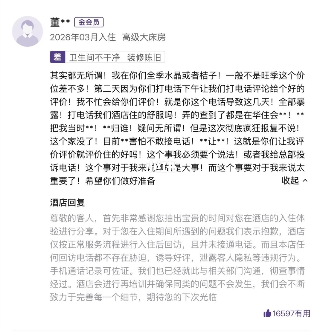 奴家董氏,华住会金会员是也,虽嫁了张三,却与那赵大有些不伶俐的勾当。昨日与他在水晶酒店吃酒,也好亲近亲近。怎料那不知趣的小二,一通回访,竟惹下塌天大祸。可恼啊!可恼!